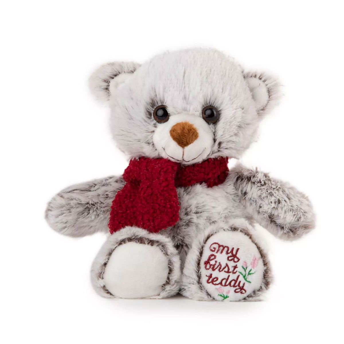 - Меко и пухкаво плюшено мече в нежен сив цвят с червен шал и бродерия „Мy first teddy“, създадено да носи уют и усмивки още от първите детски моменти.