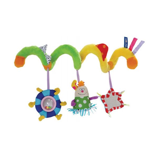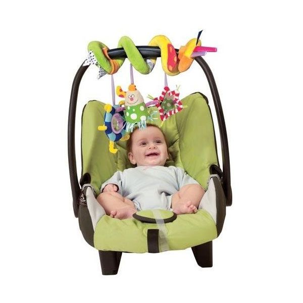 - Включва четири вида играчки - плюшена спирала, нечупливо огледало, дрънкалка и фигурка, която шуми и издава камбанен звън.
