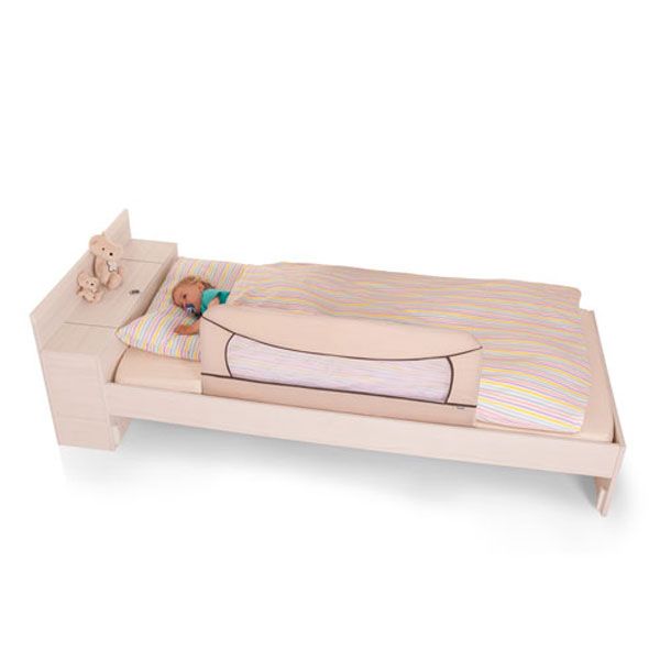 - Предпазната преграда може да се закрепи под матрака и да се свали, като така детето ще се качва в леглото без затруднения.