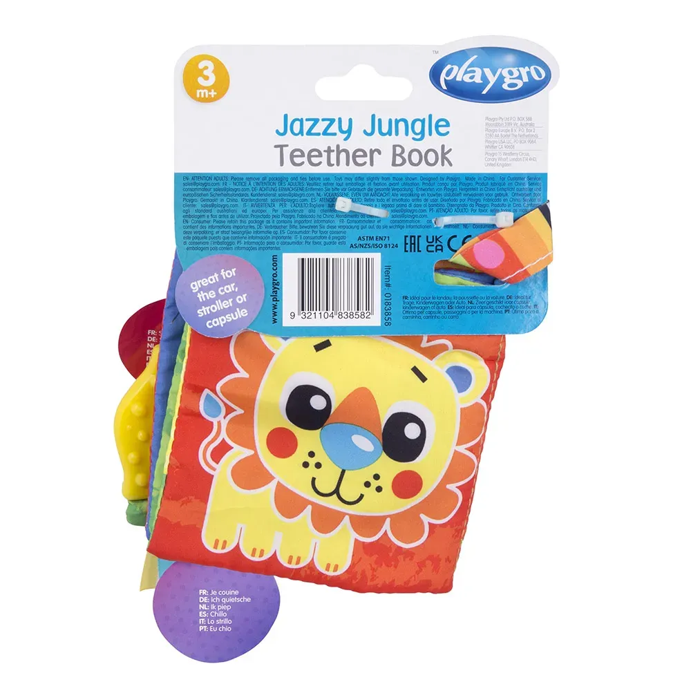 Книжка-гризалка Джунгла - Playgro мека и разноцветна играчка, снабдена с картинки на животни от джунглата, полезна за опознаването на животинския свят.
