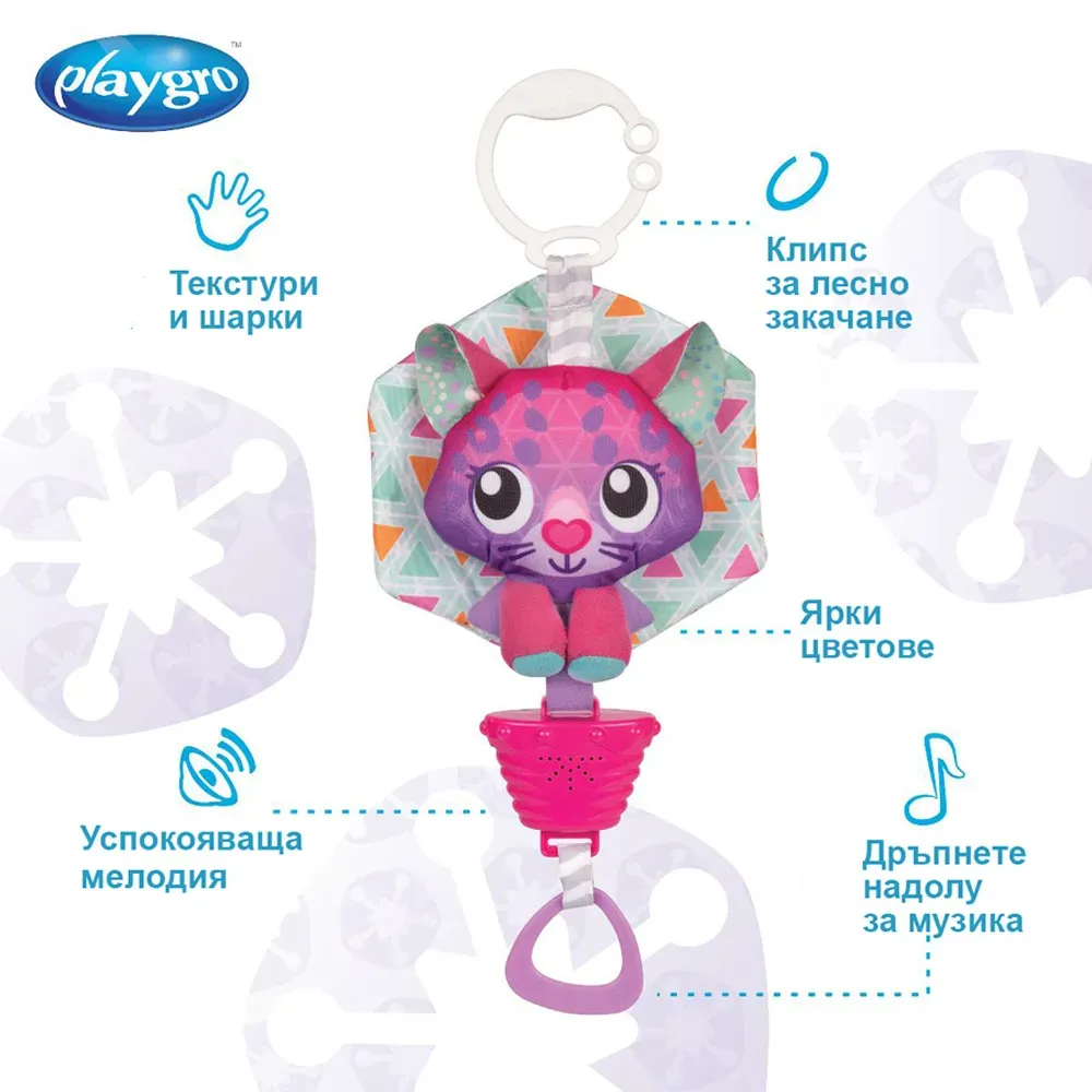 Музикална играчка Розов Леопард - Playgro е верен приятел за всяка малка принцеса както в бебешкото креватче, така и при разходка с количката или в кошчето за кола.