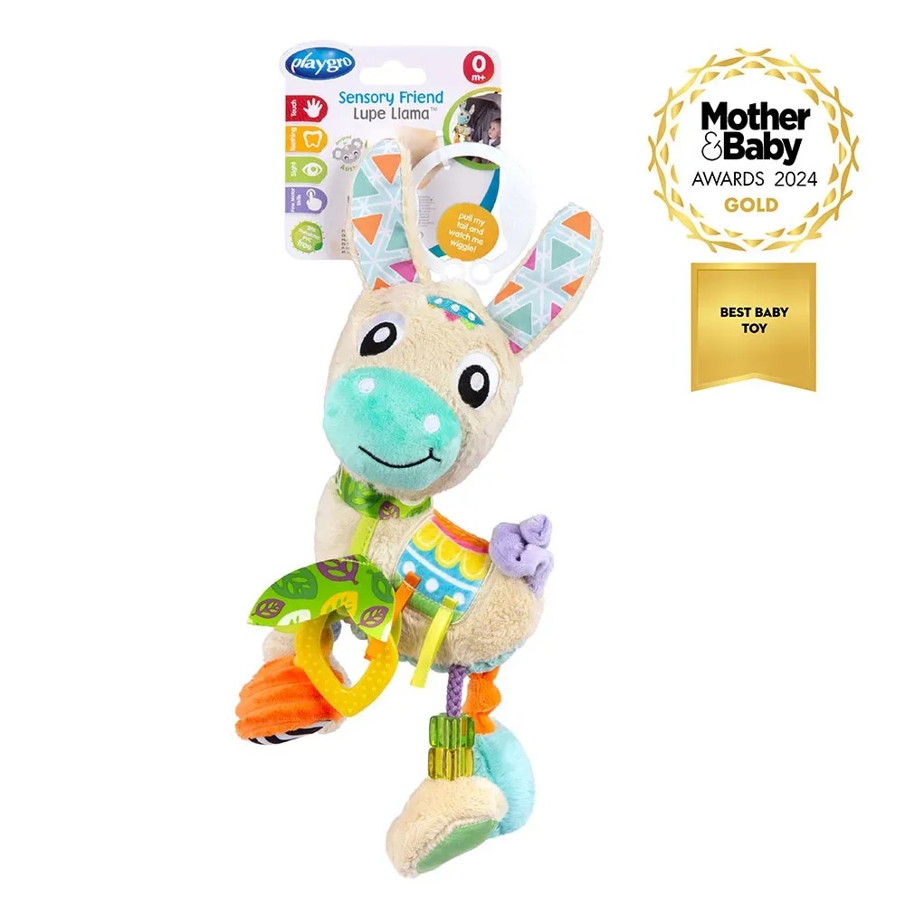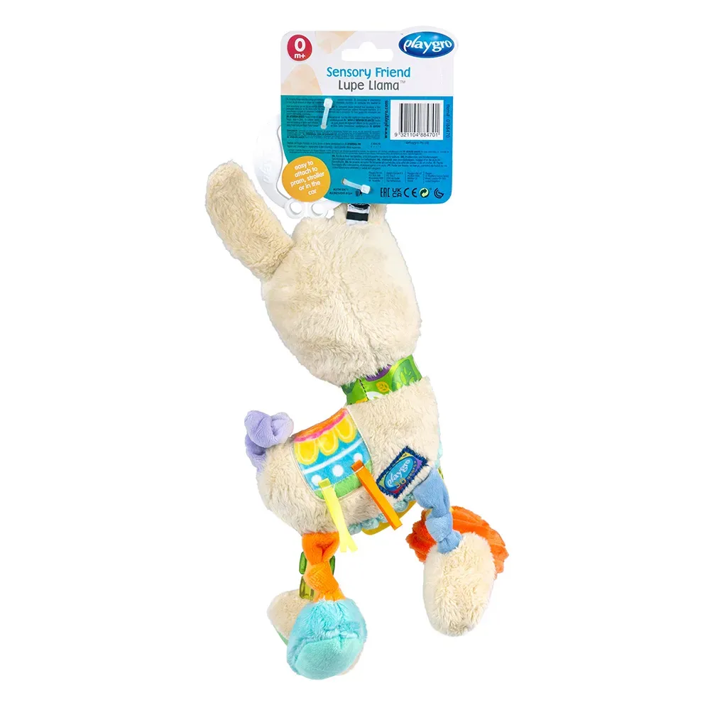 Изработена от мека и безопасна материя, Лама Лупе от серията Sensory Friend съчетава в себе си забавление и полезни функции за стимулиране на ранното детско развитие.