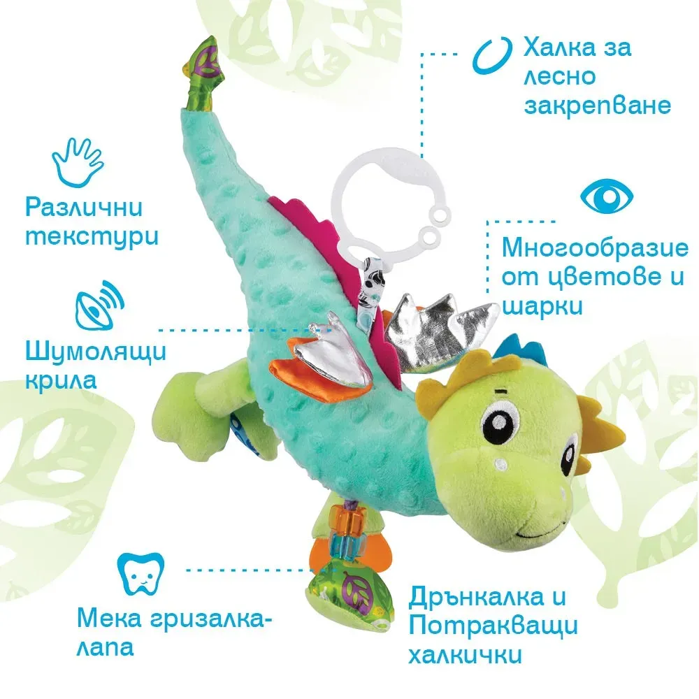 Плюшена играчка за количка Дракон Дъсти - Playgro от серията Sensory Friend е перфектният първи приятел за всяко бебче, който носи радост и комфорт навсякъде, където са заедно.