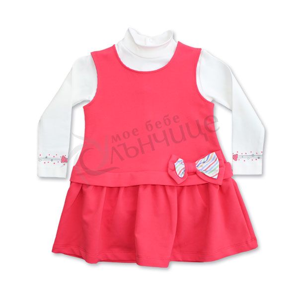 - Предлага се рокля в цвят корал в комплект с бяла блузка с дълъг ръкав