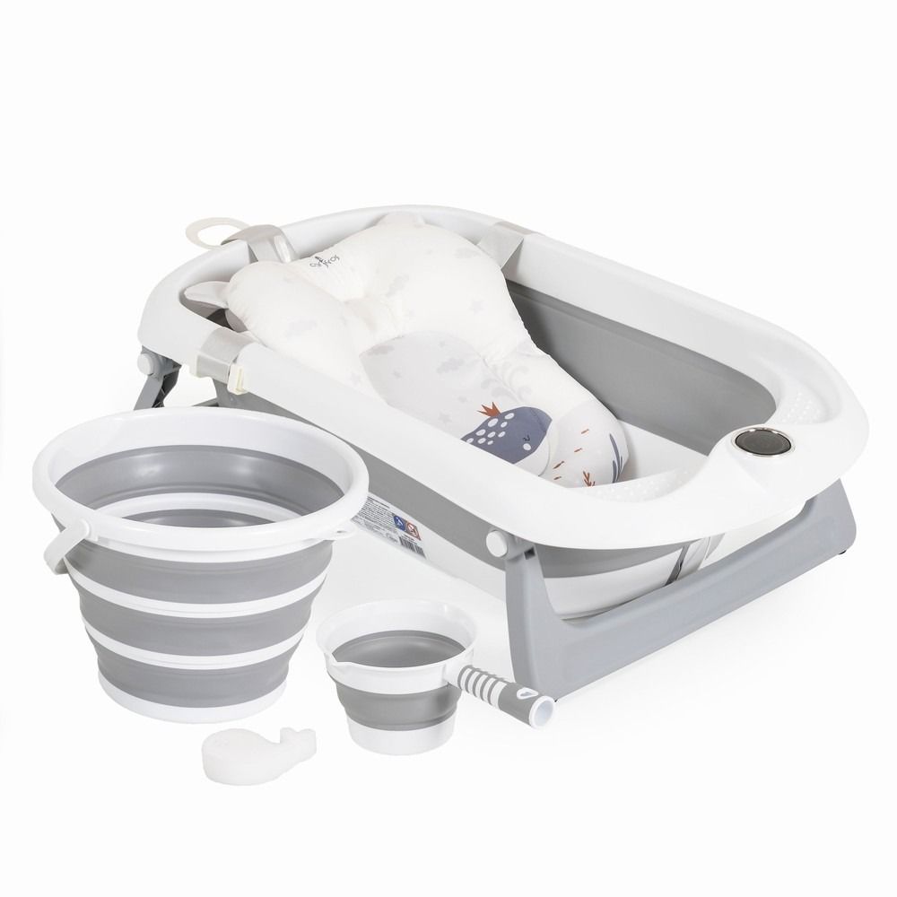 - Комплектът включва сгъваема вана, кофа, кана за поливане, мека подложка (43x33 см.) и гъба за деликатно почистване на бебешката кожа.