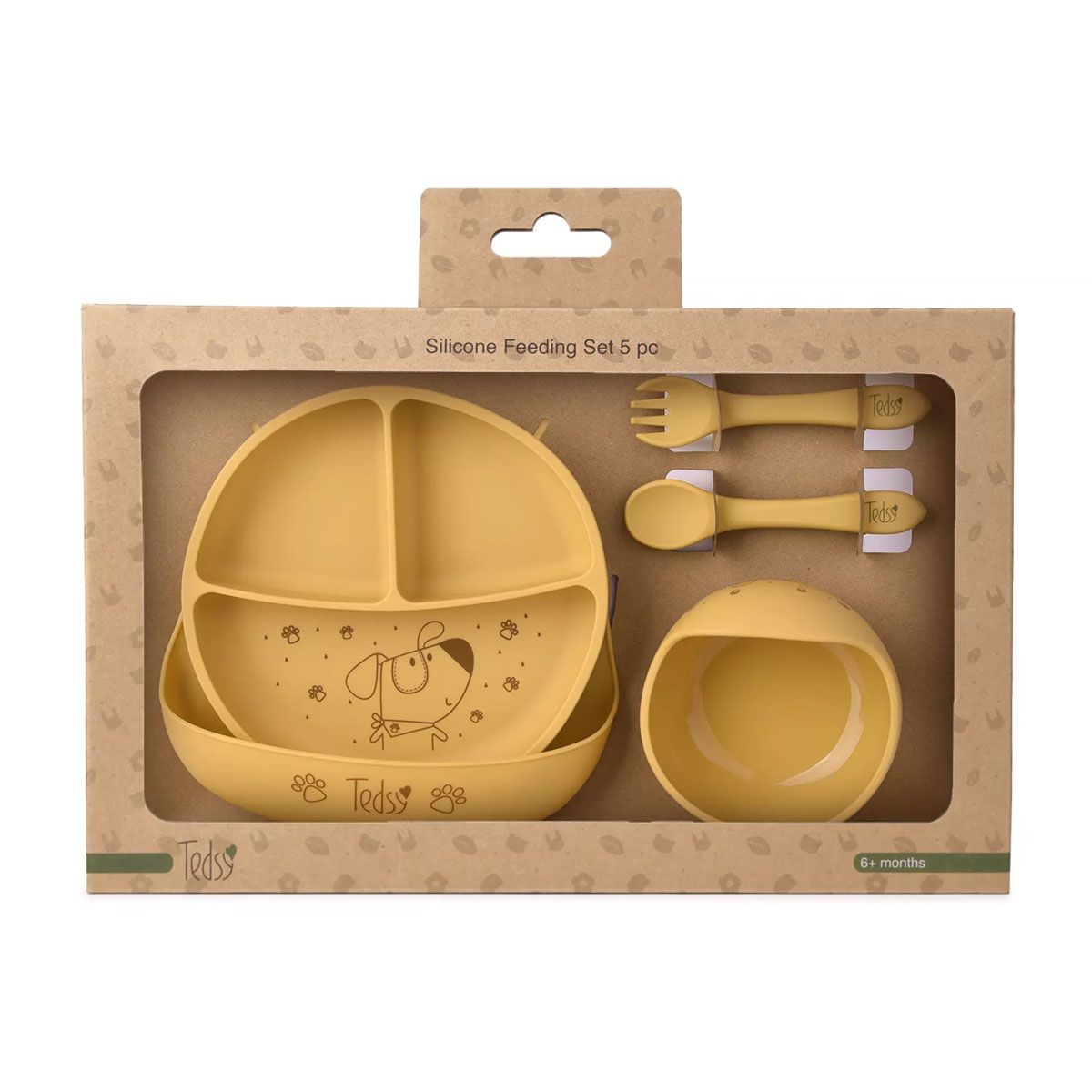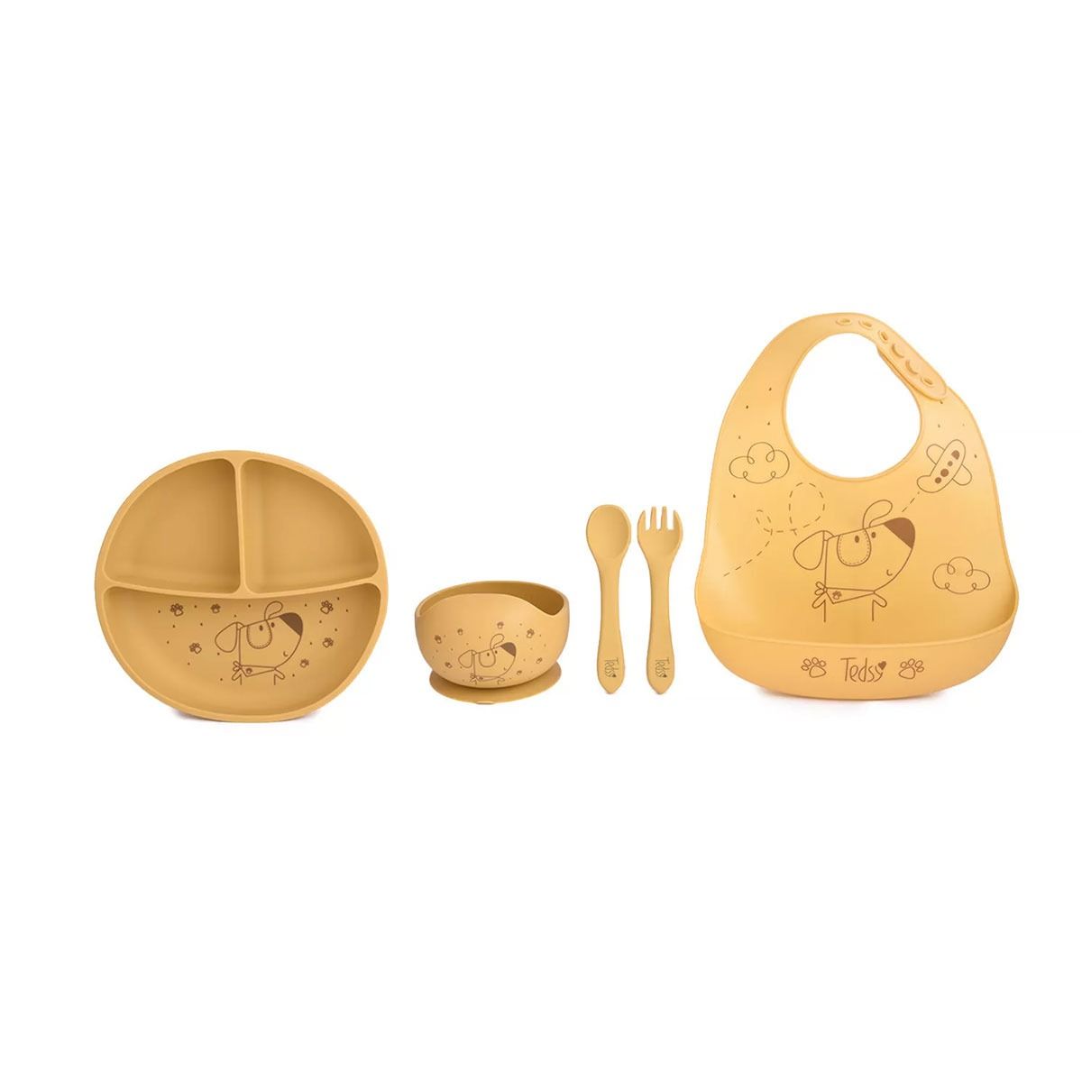 - Комплектът съдържа 5 части: купичка, чинийка с 3 разделения, лъжичка, виличка и лигавник.