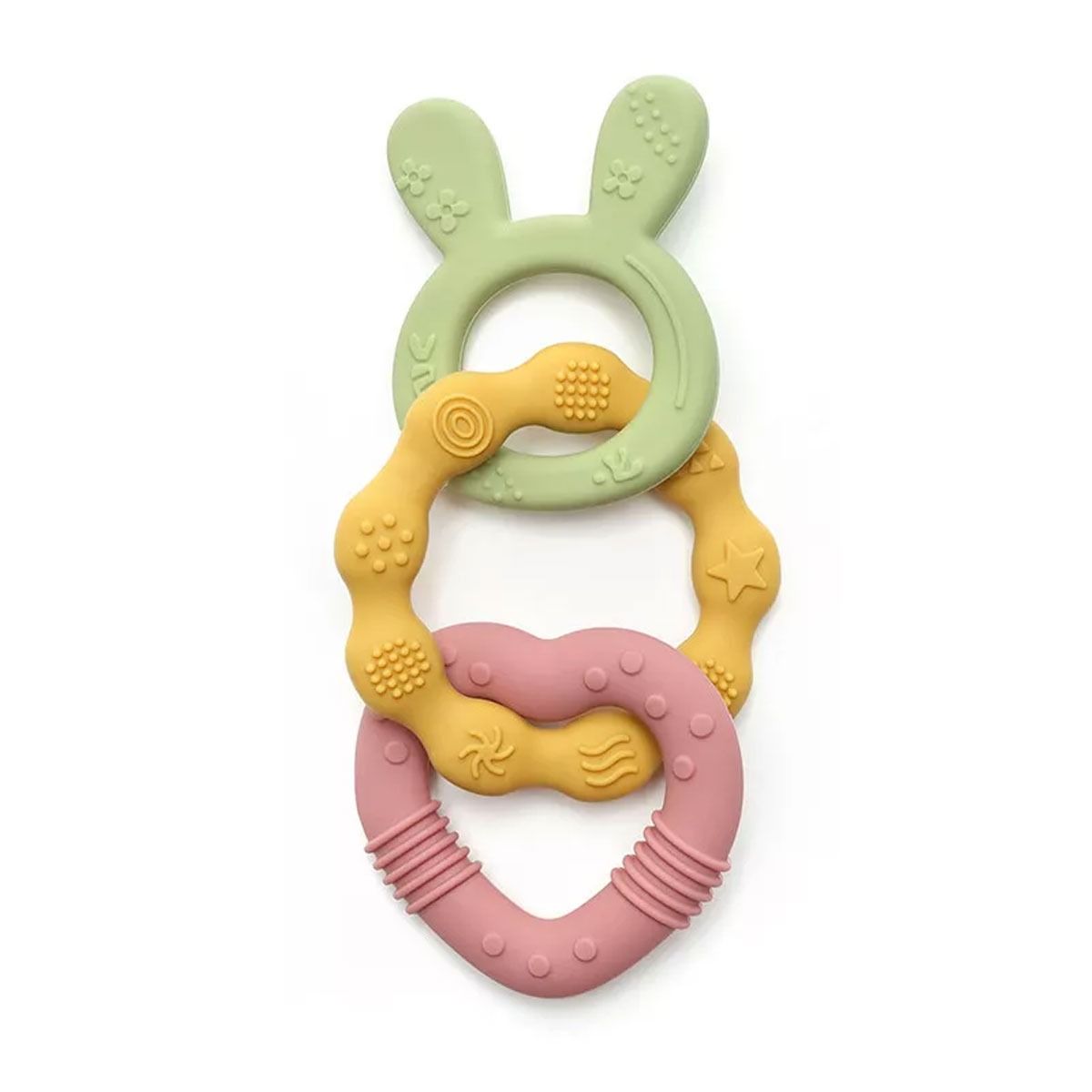 - Зона "Зайче" - Широките заешки ушички са лесни за хващане от малки ръчички, а релефните цветчета по ушичките осигуряват деликатен масаж на предните венци, като помагат на бебето да развие хватката и координацията си.
