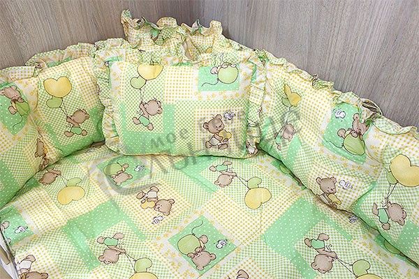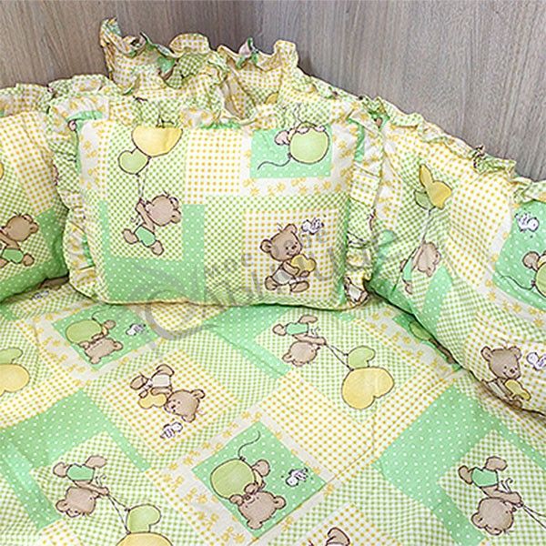 - Комплектът се предлага в свежа комбинация от зелен и жълт цвят с декорация на мечета.