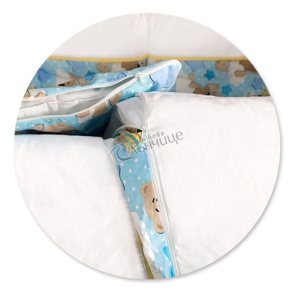 - Олекотената завивка и възглавницата са поставени в собствени калъфки, снабдени с цип за лесно сваляне.