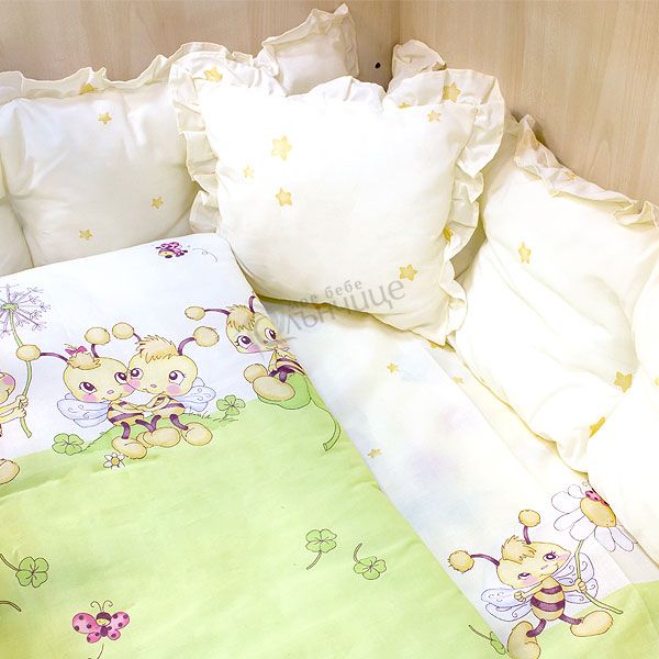 - Комплекта е от седем части, предлага се в слънчево и нежно жълто с щампа на пчелички.