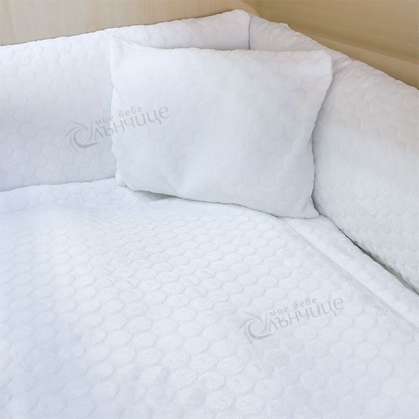 - Включва долен чаршаф с ластик, олекотена завивка, възглавница и четири броя обиколници.