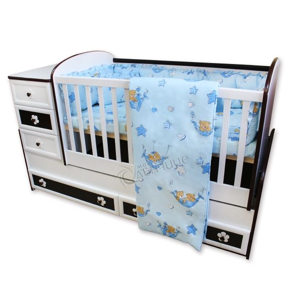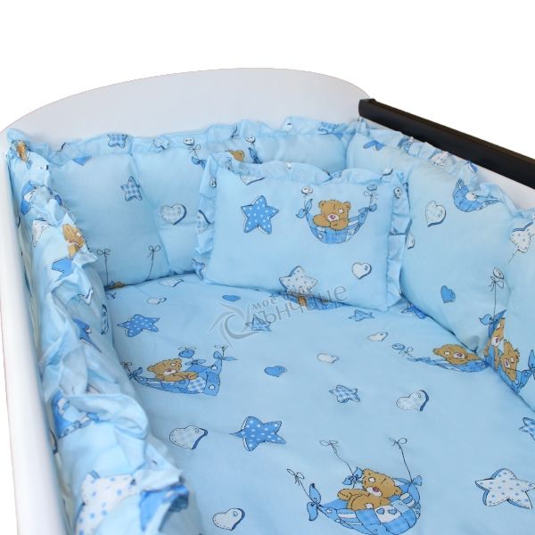 - Комплектът се предлага в син цвят с много симпатична декорация на меченца в люлка.