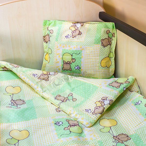 - За сладък сън комплекта се предлага в свежа комбинация от зелен и жълт цвят с добавени сладки мечета.