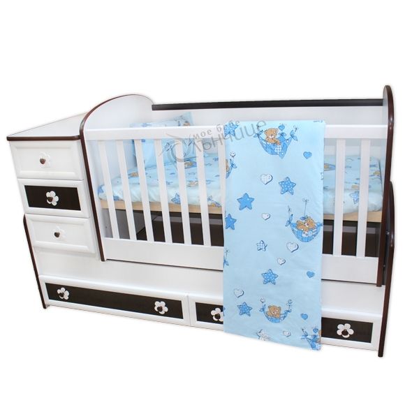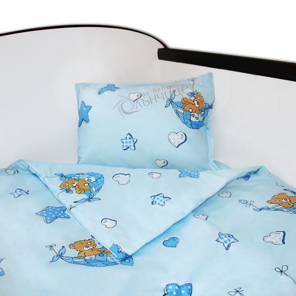 - Комплектът се предлага в син цвят с много симпатична декорация на меченца в люлка.