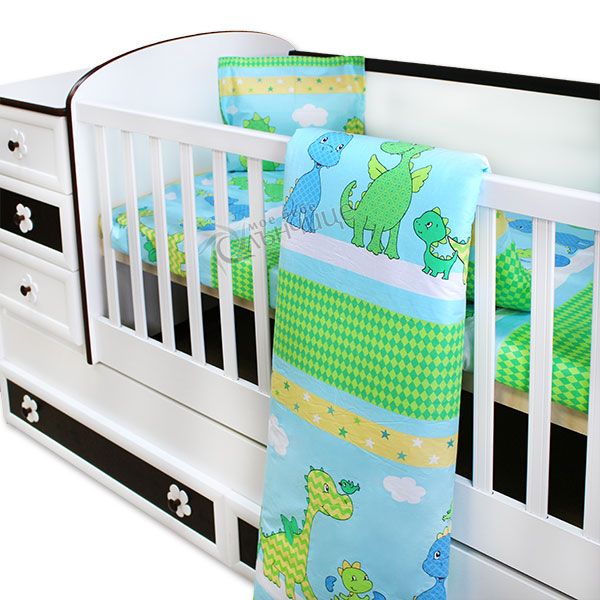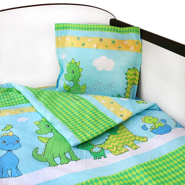 - Спалния комплект се в много слънчева и симпатична декорация с динозаври.