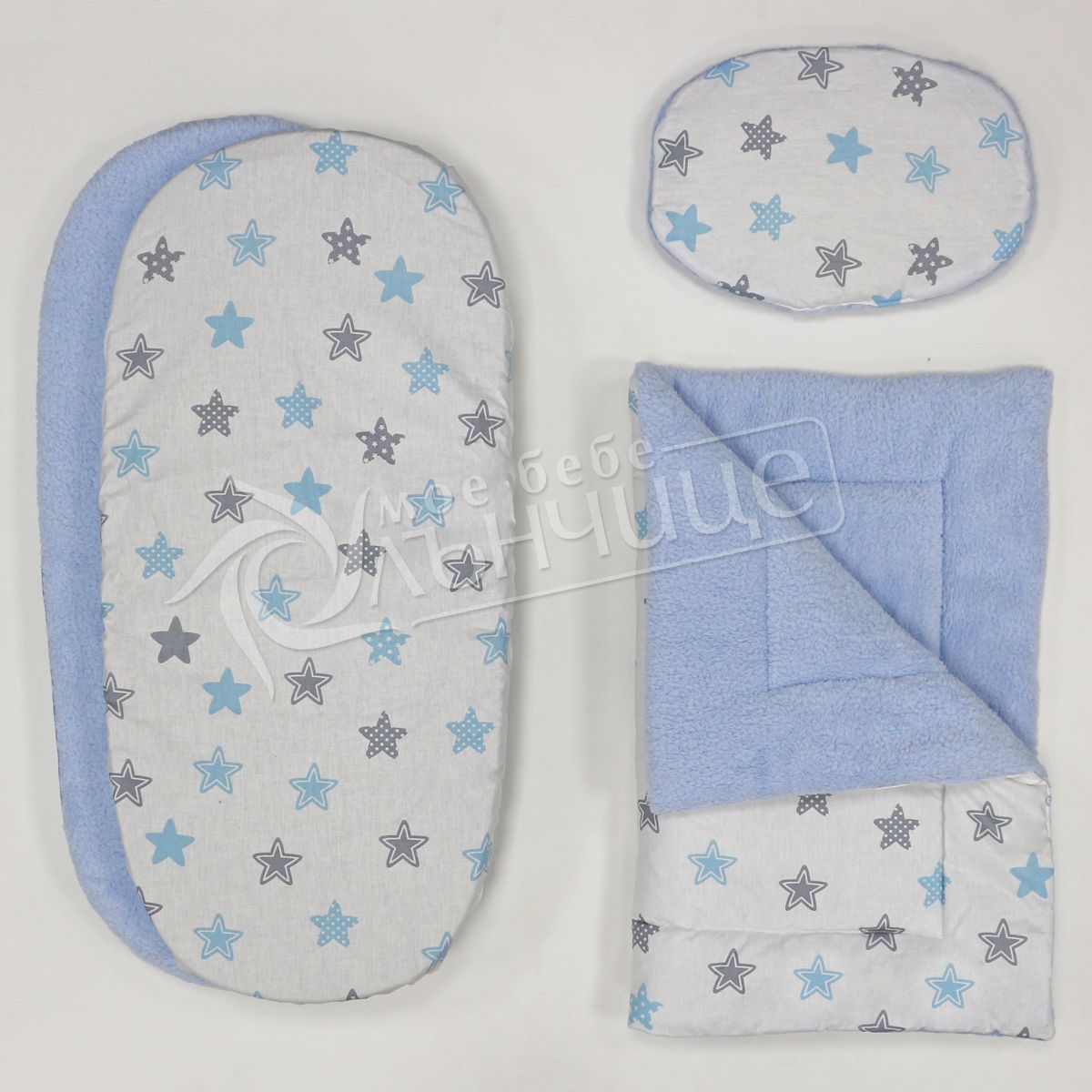 - Вътрешната част на възглавничката, завивката и чаршафчето Soft touch са изработени от мекa кохавлия, а памучното чаршафче и лицето на възглавничката и завивката от 100% памучен ранфорс.